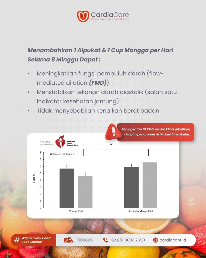Walaupun penelitian spesifik mengenai kombinasi mangga dan alpukat masih terbatas, profil nutrisi keduanya mendukung pola makan kardioprotektif yang konsisten dengan diet Mediterranean dan DASH.