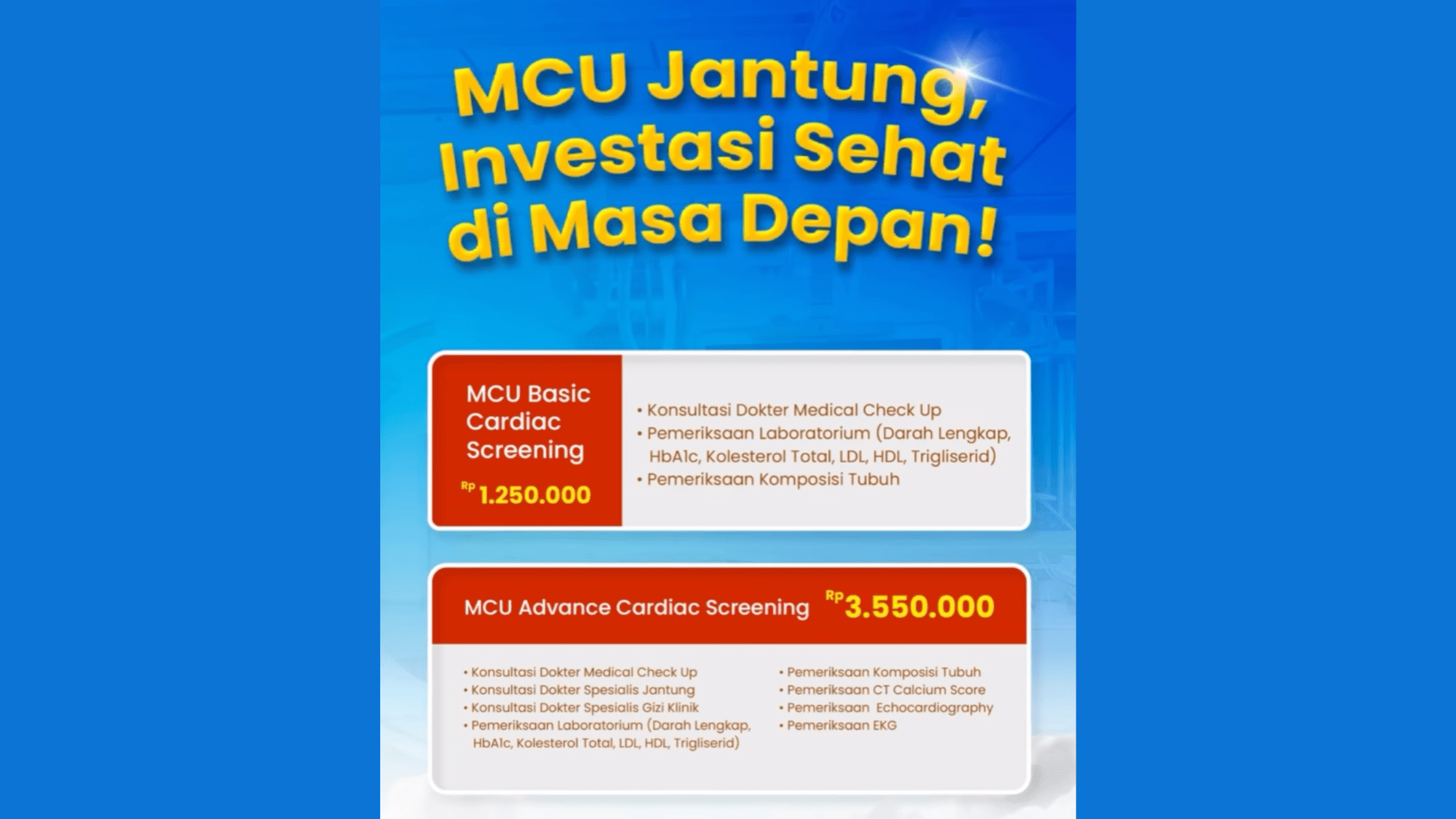Melalui Medical Check Up (MCU) Jantung, Anda dapat mengetahui kondisi jantung dan pembuluh darah secara menyeluruh—sehingga langkah pencegahan bisa dilakukan lebih cepat dan tepat.