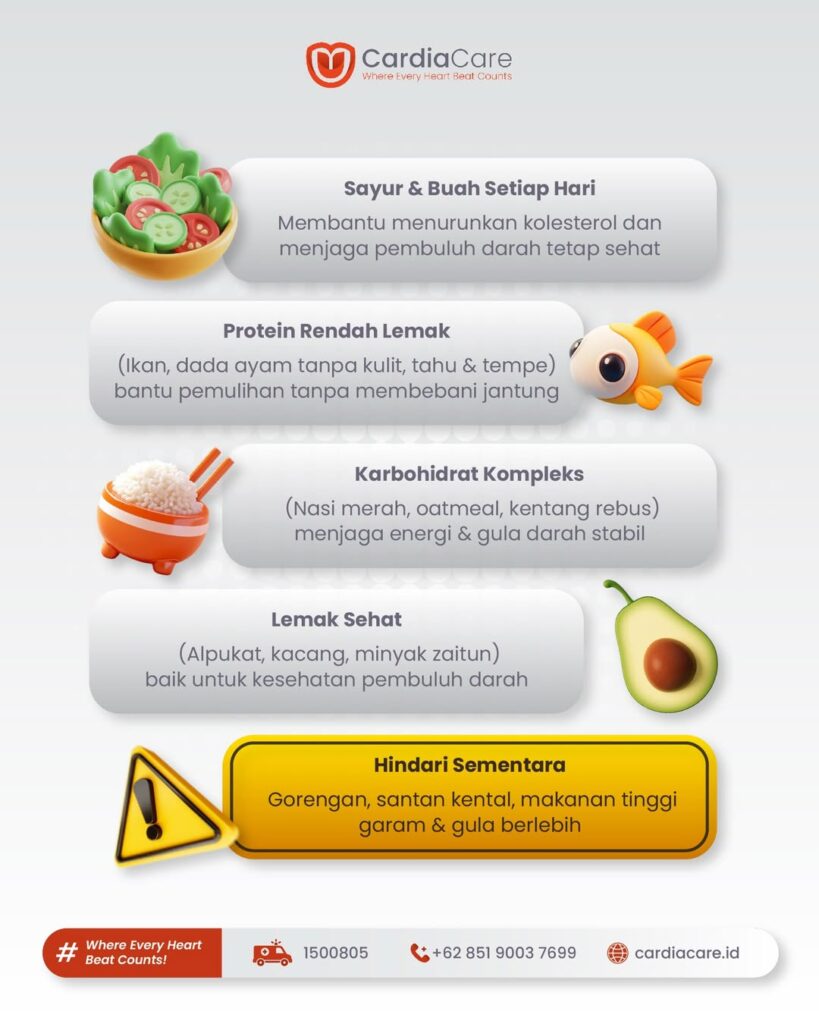 Pola makan sehat merupakan bagian penting dari perawatan pasca serangan jantung. Dengan memilih sayur dan buah, protein rendah lemak, karbohidrat kompleks, serta lemak sehat, dan menghindari makanan berisiko tinggi, pasien dapat mendukung pemulihan jantung dan meningkatkan kualitas hidup secara berkelanjutan.