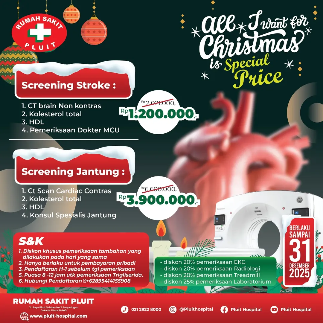 Menjelang akhir tahun, menjaga kesehatan menjadi hadiah terbaik untuk diri sendiri dan keluarga. Dalam rangka menyambut Natal, Rumah Sakit Pluit menghadirkan promo spesial Screening Stroke dan Screening Jantung dengan harga istimewa hingga 31 Desember 2025.
