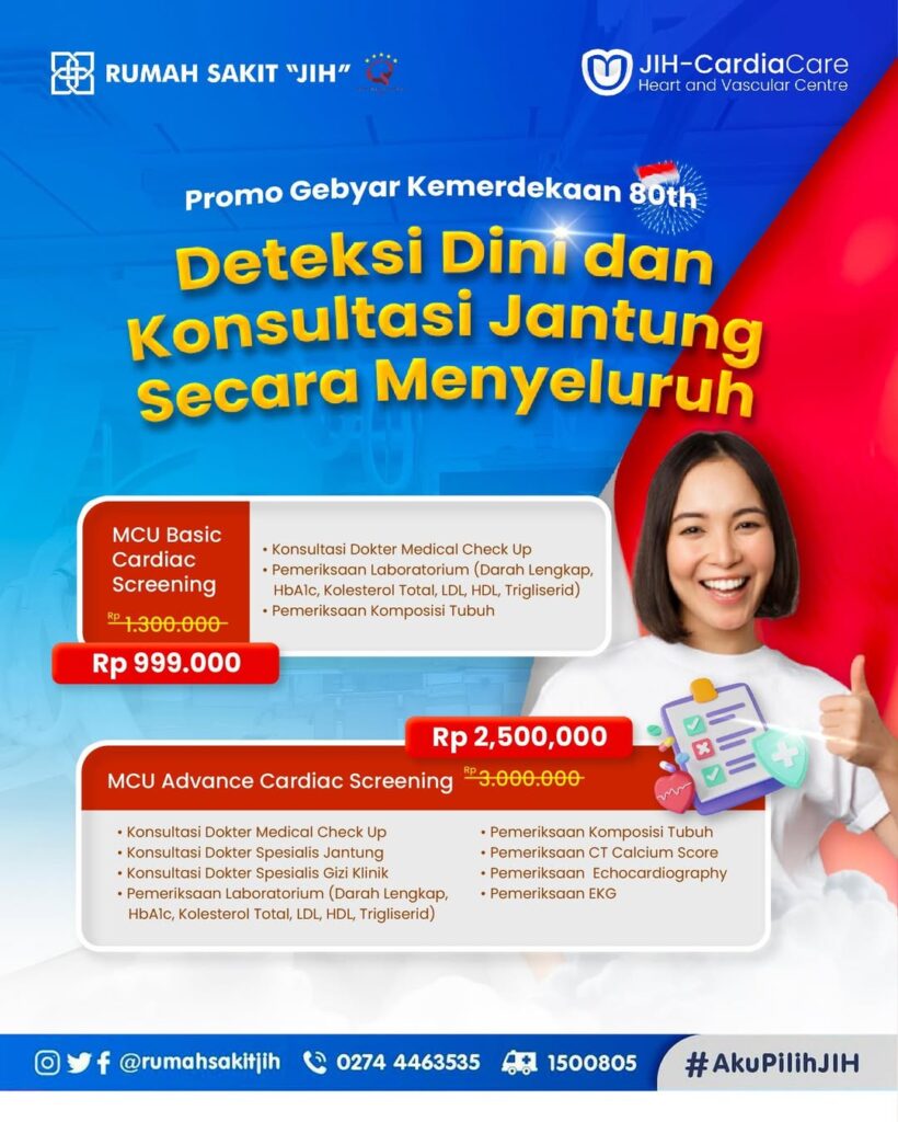 Kini, JIH-CardiaCare menghadirkan promo paket MCU (Medical Check Up) jantung dengan harga spesial yang bisa Anda pilih sesuai kebutuhan.